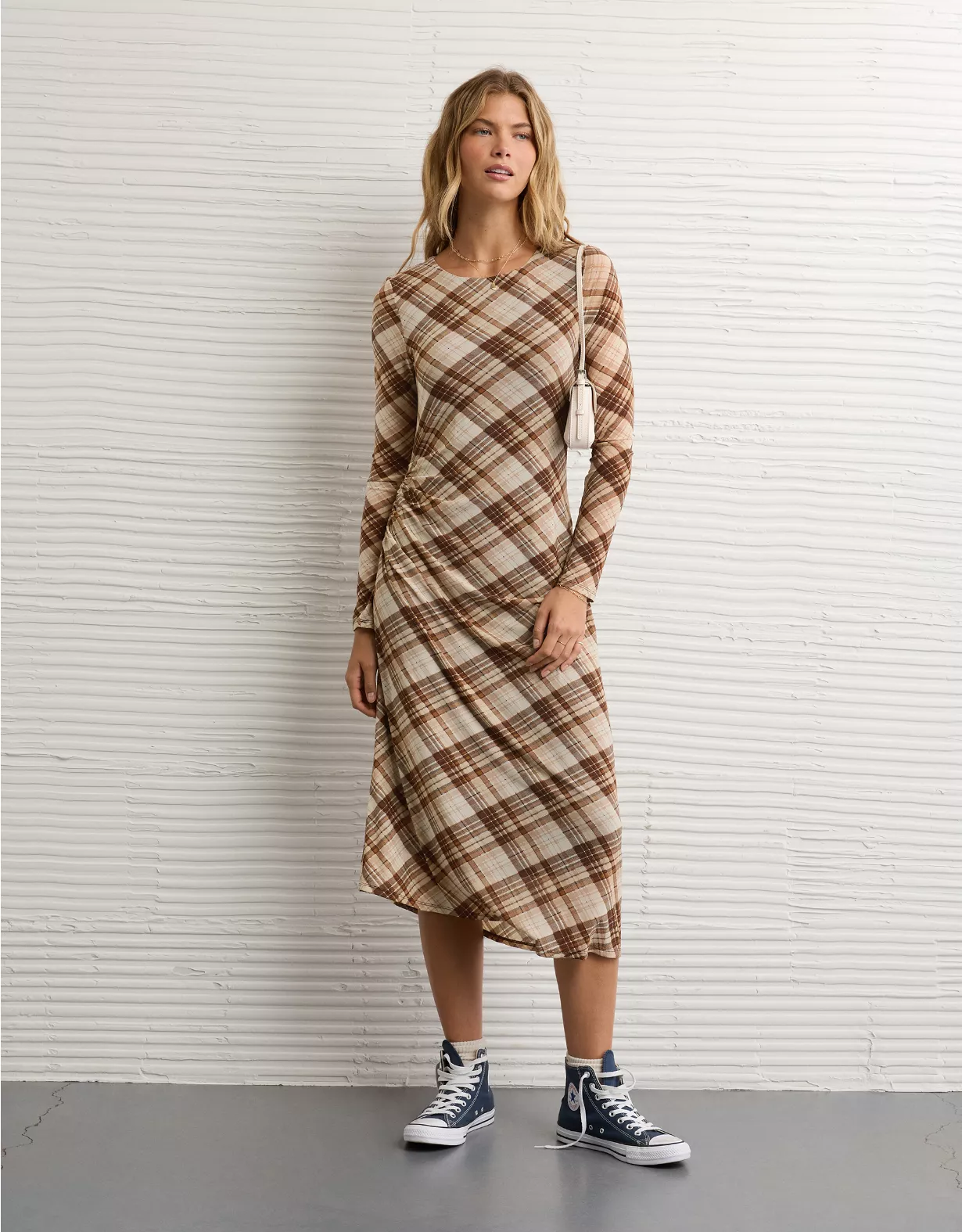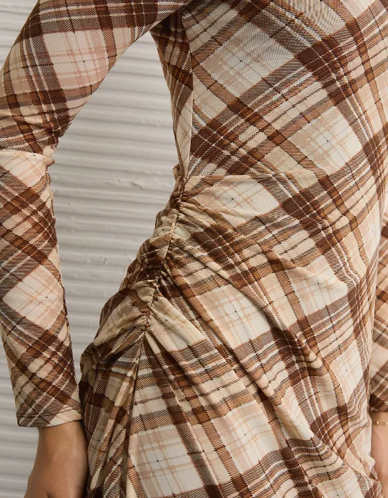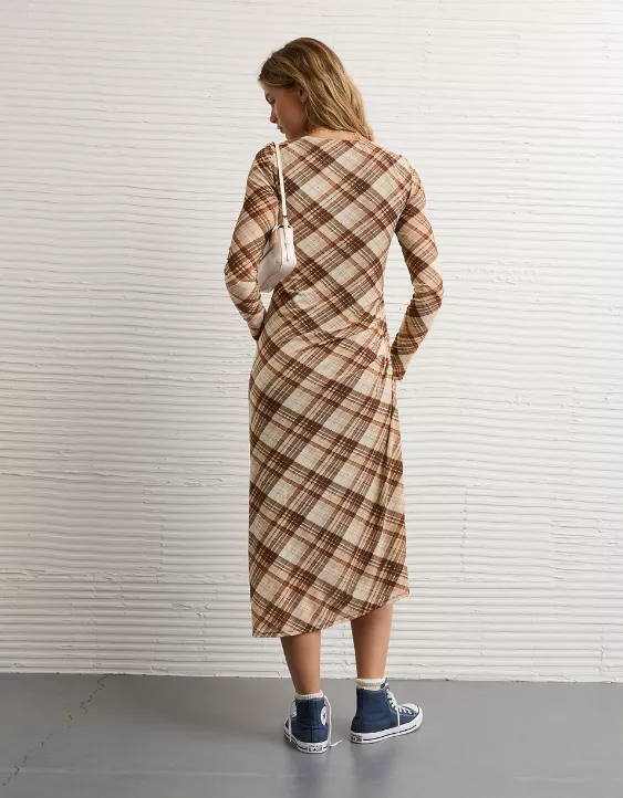 A statement-making plaid midi dress with a hanky hem, perfect for dressing up or keeping it casual.