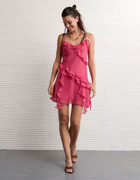 A flouncy, versatile mini dress, featuring an asymmetrical ruffle detail for some extra flair.