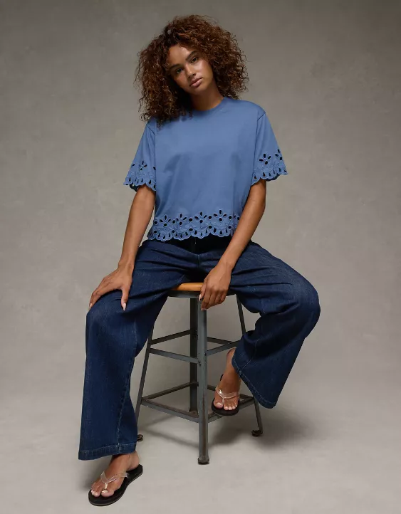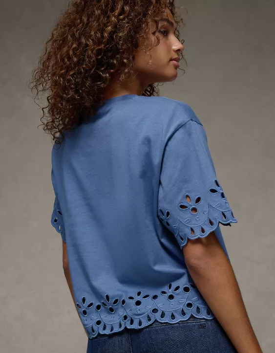 Your go-to tee with a feminine twist, featuring feminine eyelet details.