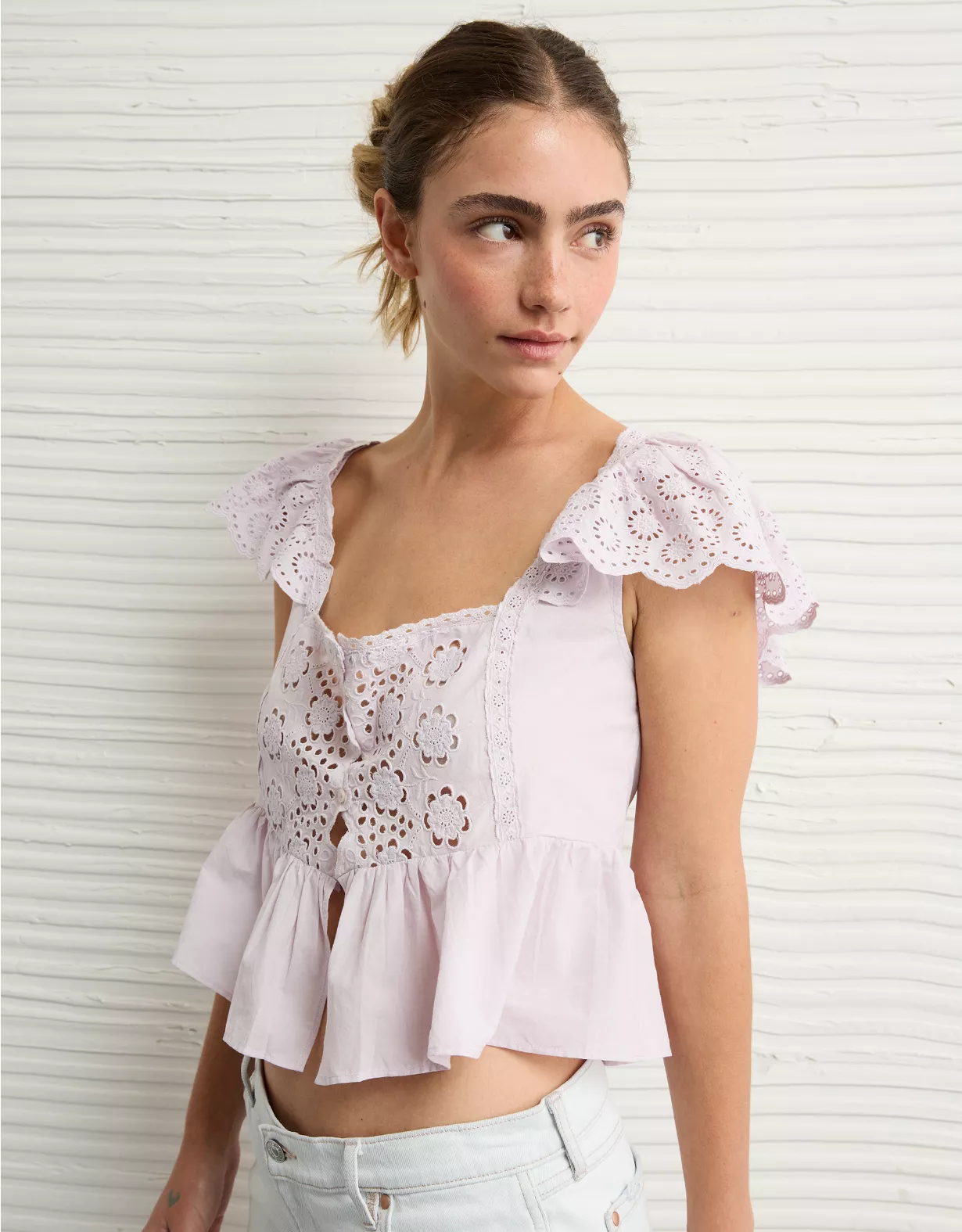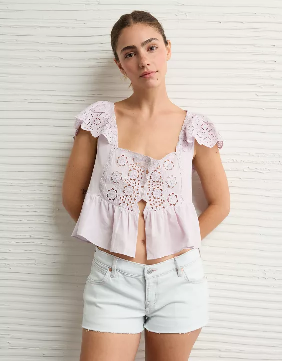 A frilly, sweet blouse with breezy summer vibes, featuring intricate eyelet embroidery.