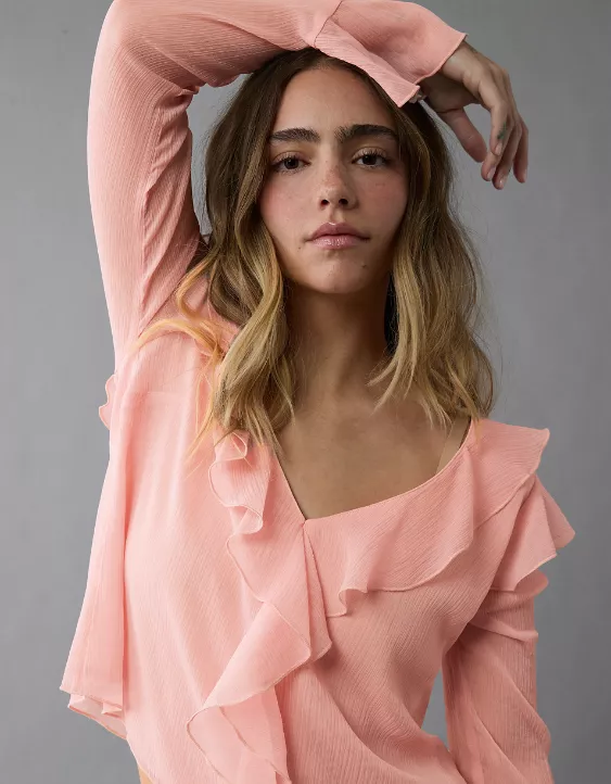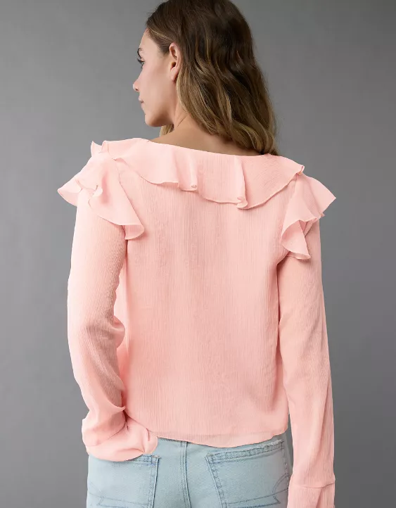 AE Chiffon Bell Sleeve Ruffle Blouse Light Pink