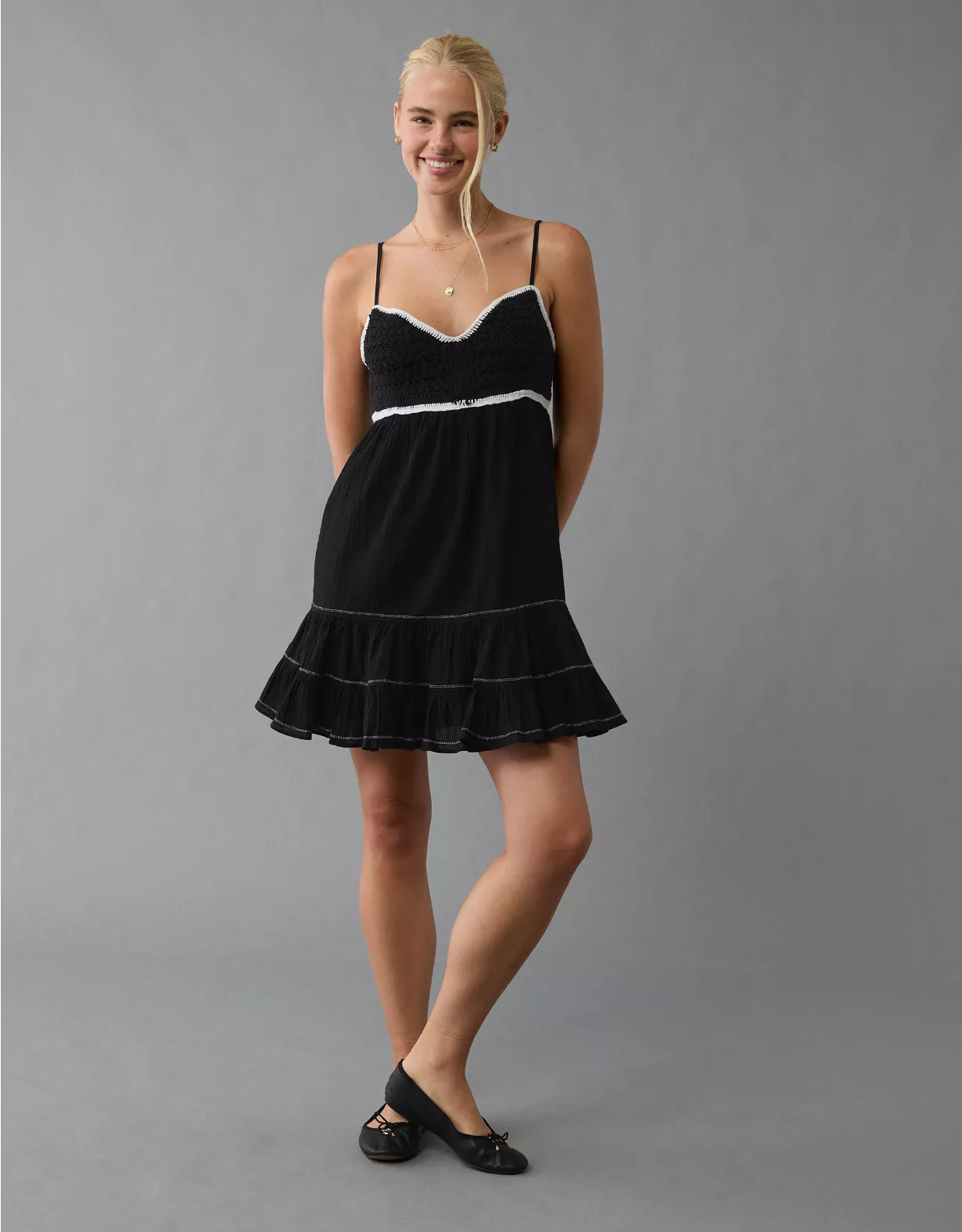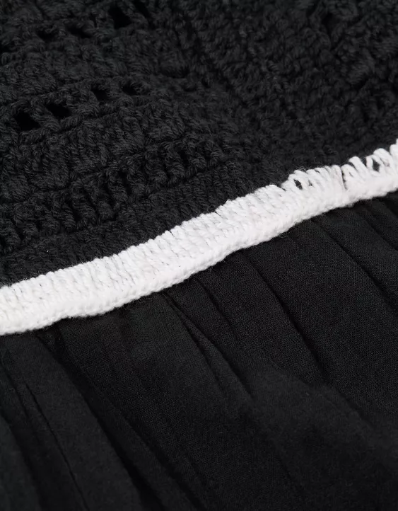 A boho chic dress that’s perfect for a beachy vibe, featuring a crochet bust.
