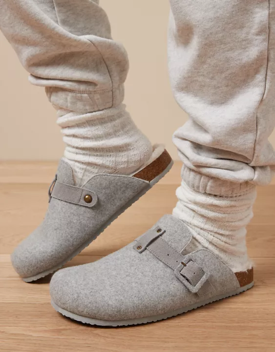 Slip on & go! These cozy felt slippers are designed with a soft faux shearling lining & tonal strap along the upper for a fun, utilitarian finish.
