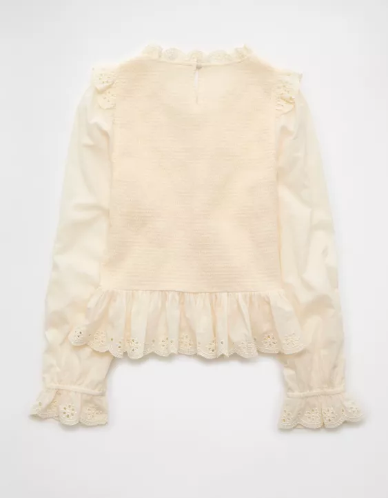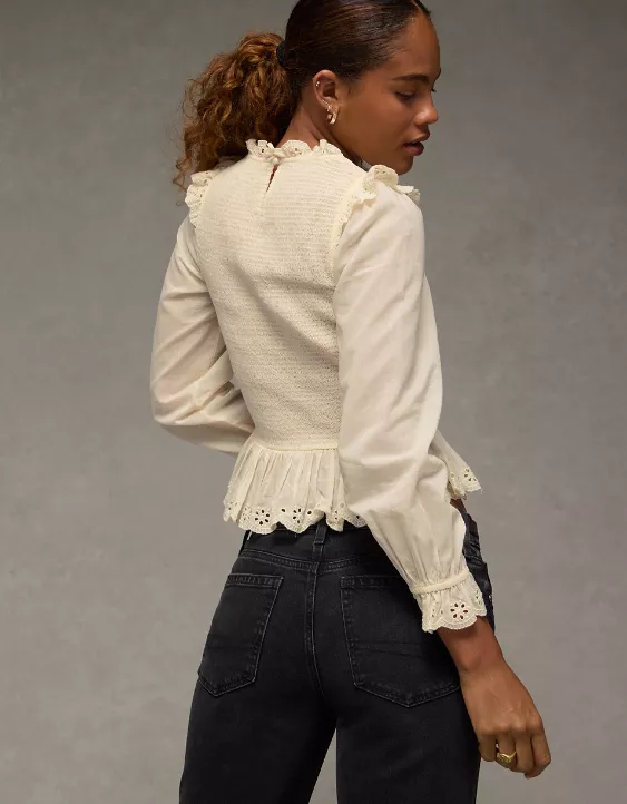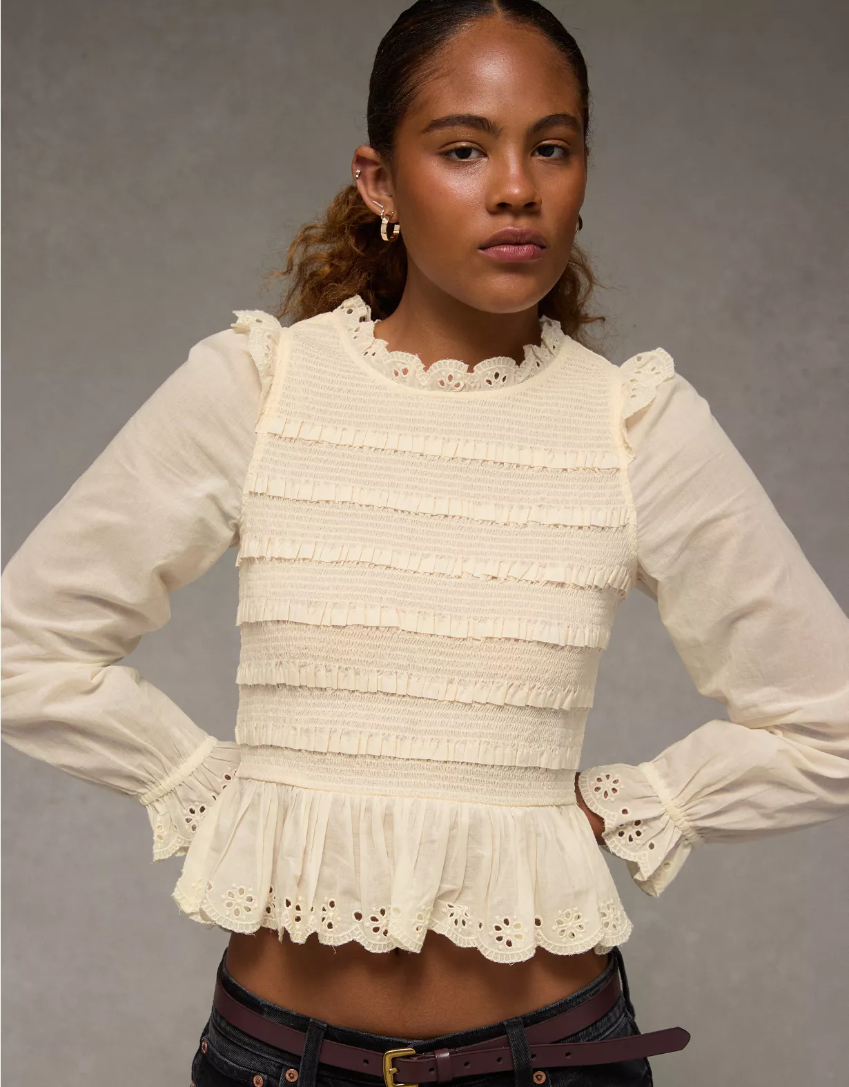 A playful, feminine babydoll blouse with smocked detailing, perfect for a flirty day-to-night look.