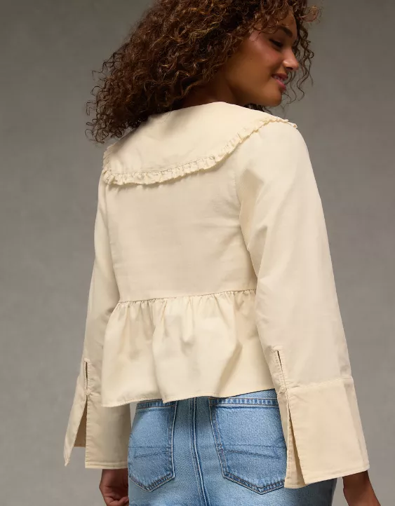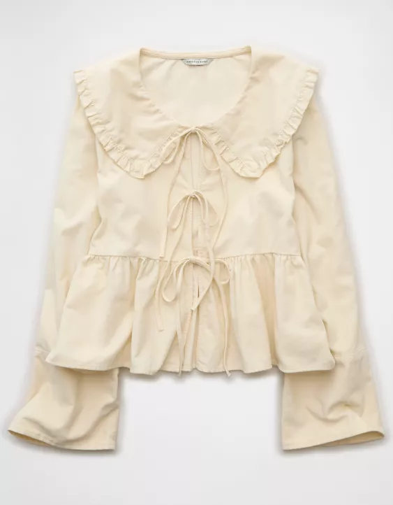 A playful, oversized collar and a flirty tie front add a romantic touch to this classic blouse, perfect for dressing up or keeping it casual.