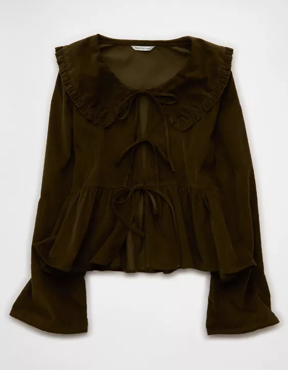 A playful, oversized collar and a flirty tie front add a romantic touch to this classic blouse, perfect for dressing up or keeping it casual.