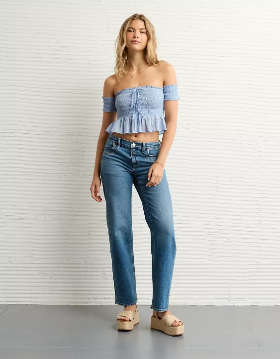 AE Off The Shoulder Smocked Tie Front Crop Top Light Blue
