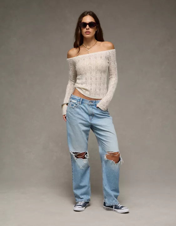 An off-the-shoulder sweater with long sleeves, perfect for transitioning from day to night.