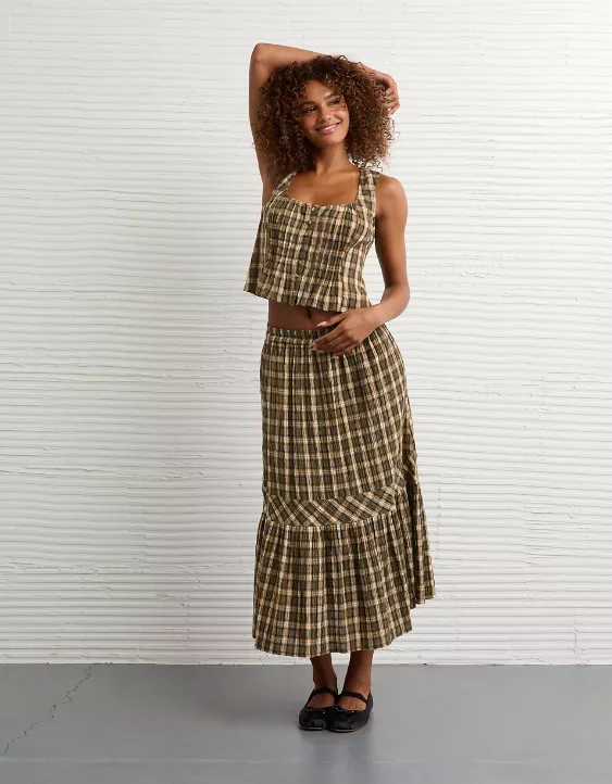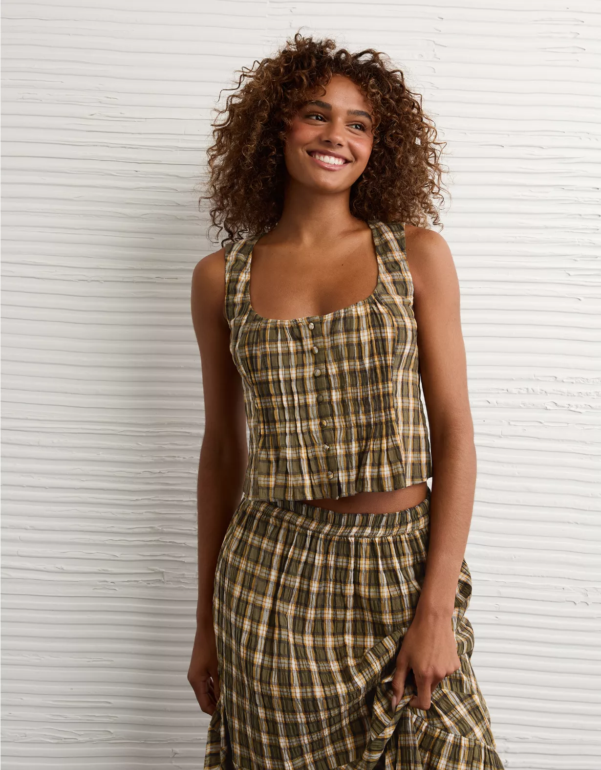 A femme, flowy corset tank with a square neck and pintuck detailing, perfect for a romantic, going-out look.