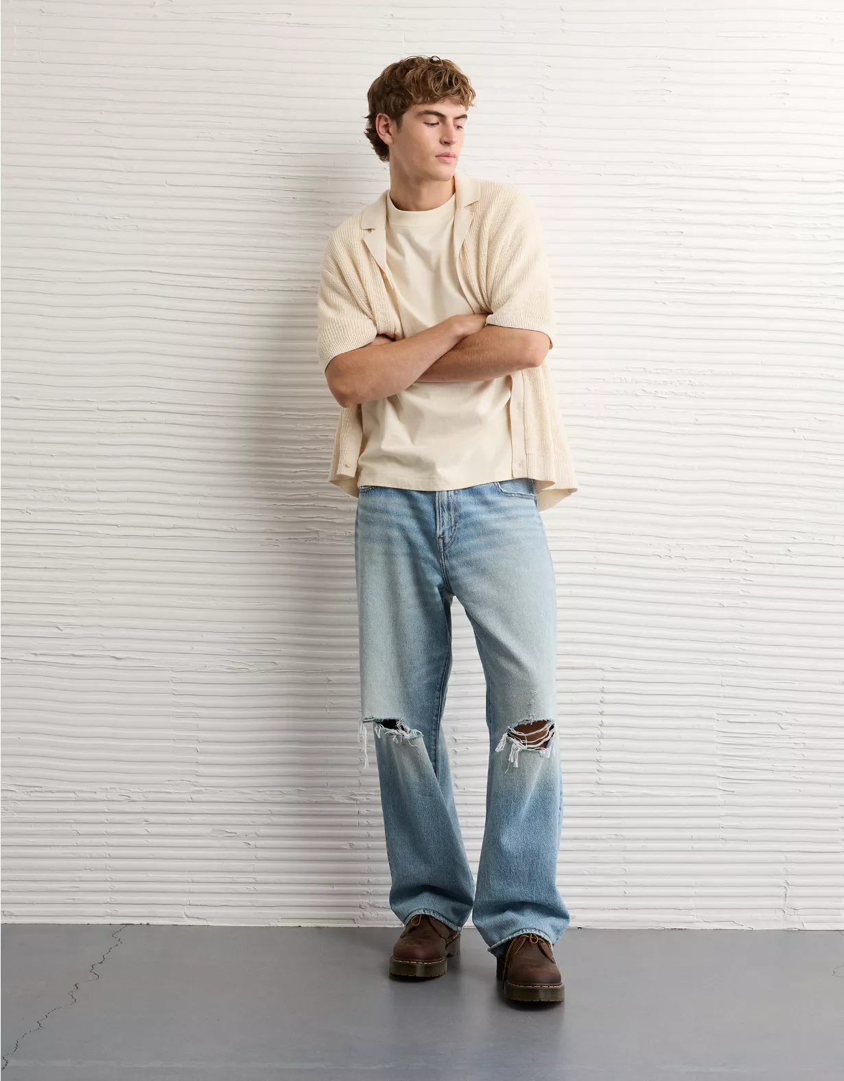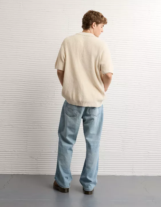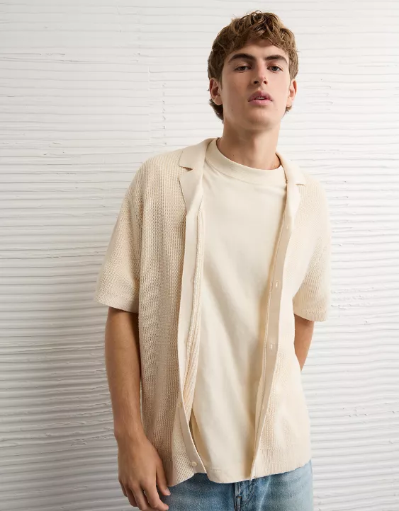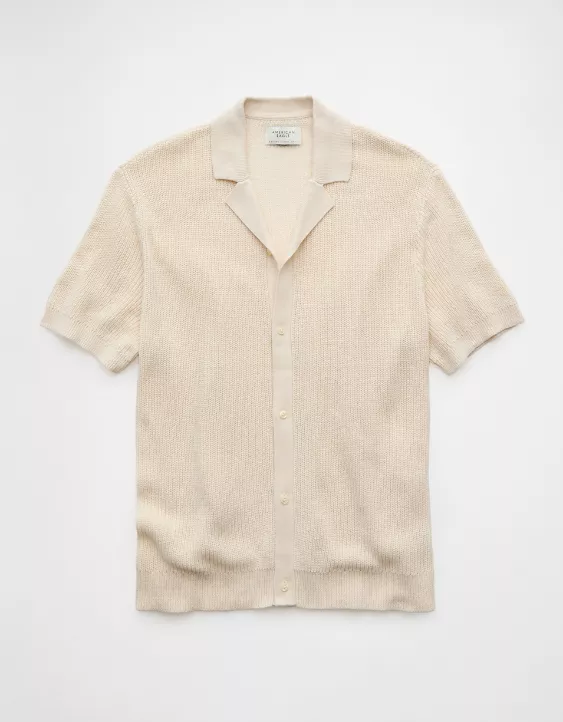 AE Shaker Button-Up Sweater Polo Shirt Cream