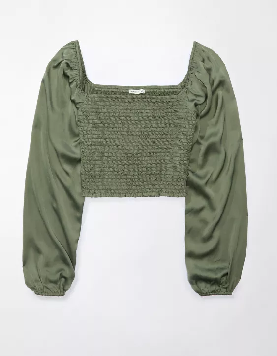 Featuring pretty smocked detailing along the bodice, this silky satin shirt is a free-spirited favorite.