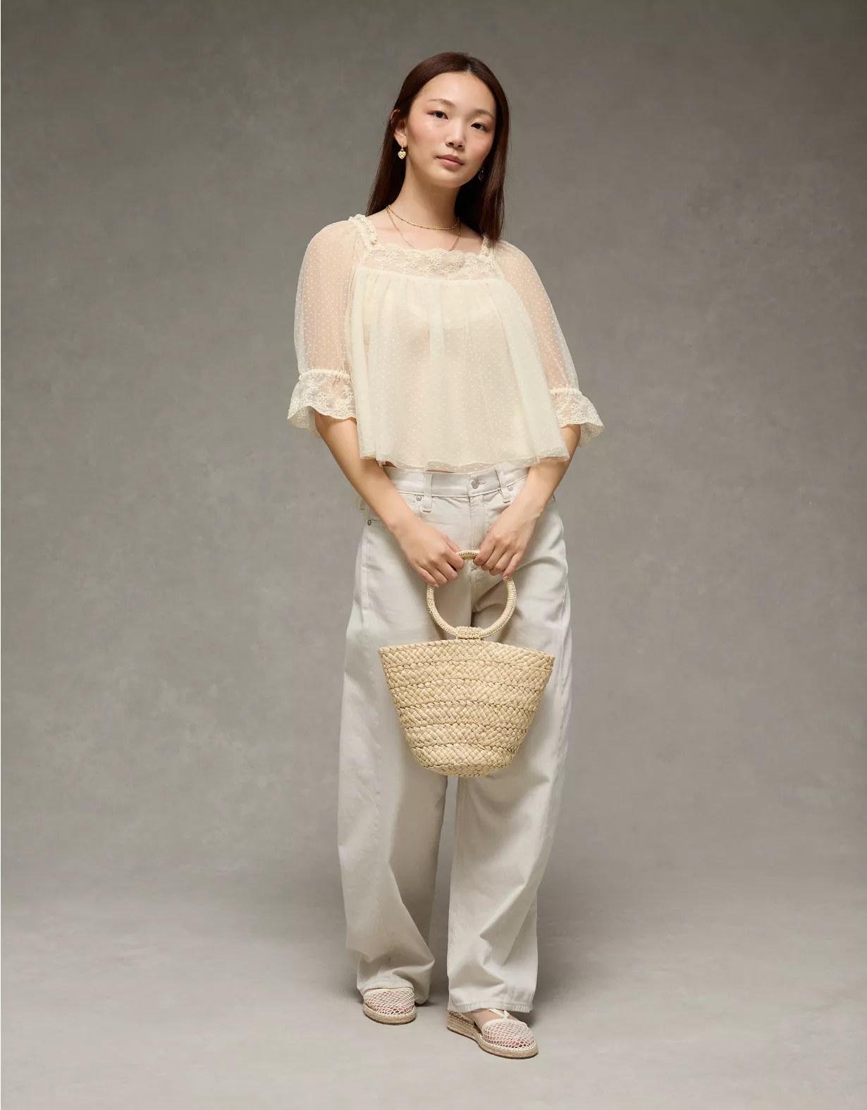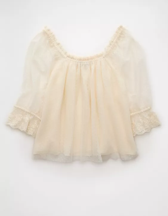 A fun, feminine blouse, featuring a mesh overlay for a textural touch.