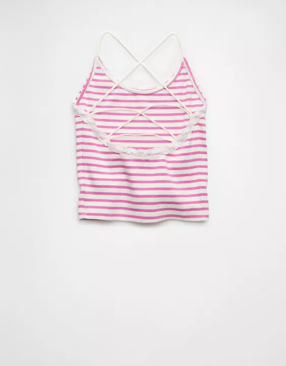 A tiny tank that’s perfect for layering or rocking solo, featuring a femme lace touch and criss-cross straps for some extra style.