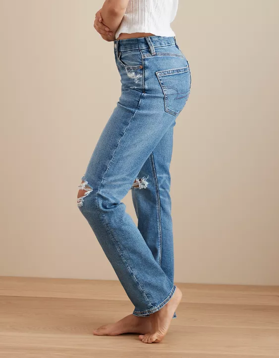 AE Stretch Curvy Ripped Straight Jean Medium Destroy