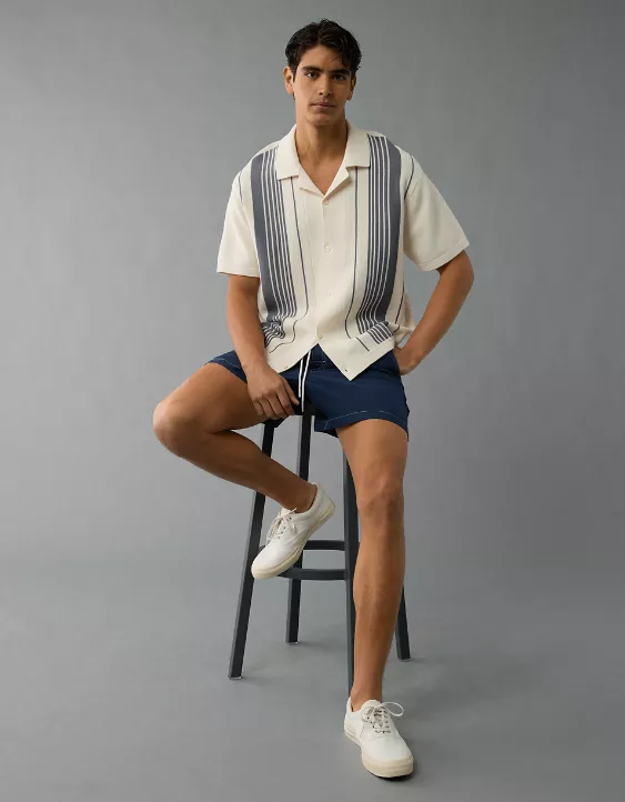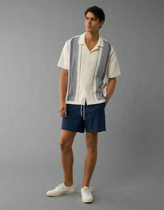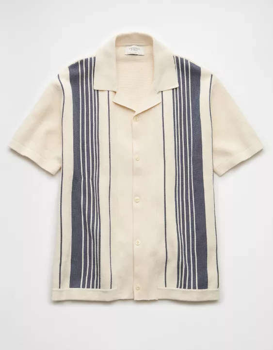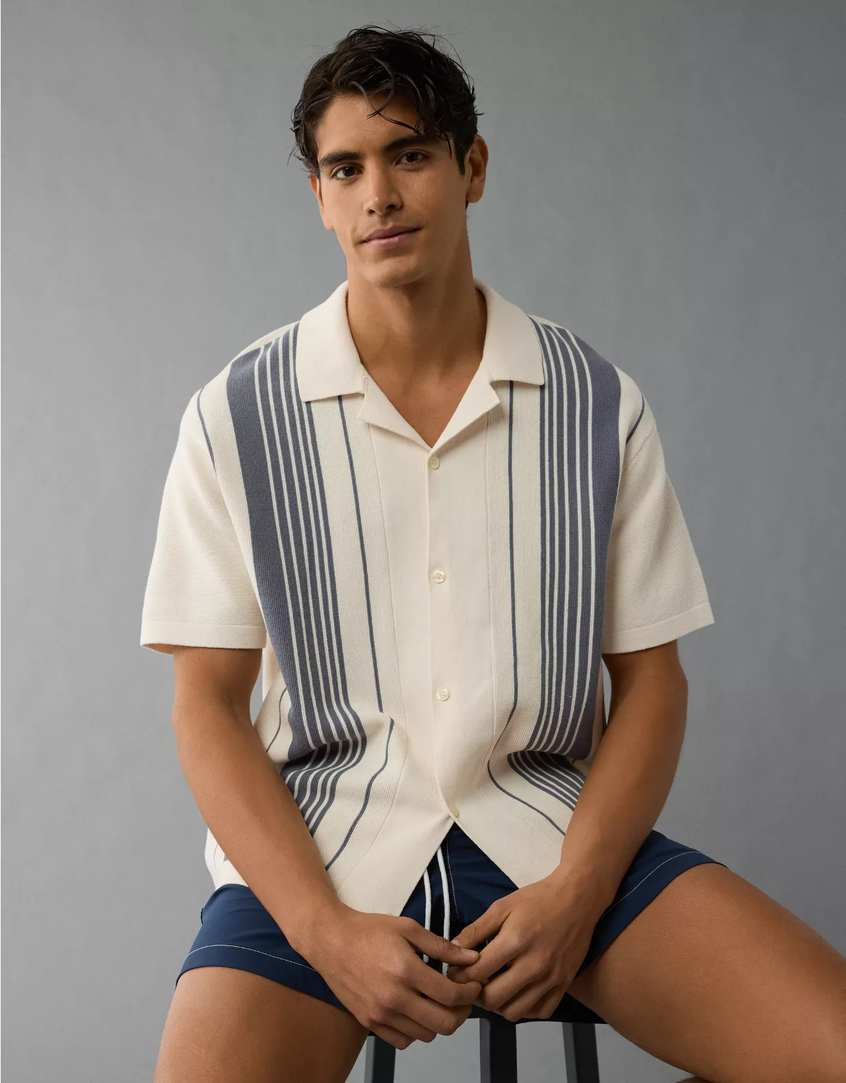 AE Weekend Striped Button-Up Sweater Polo Shirt Frosty Cream