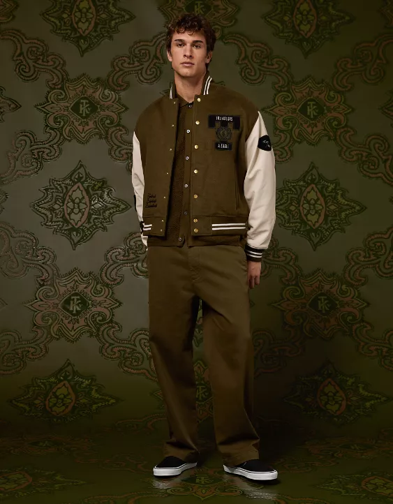 This traditional letterman jacket gets upgraded in luxe fabrics featuring a brushed flannel construction with genuine leather sleeves and chainstitched bouclé felt appliqué.