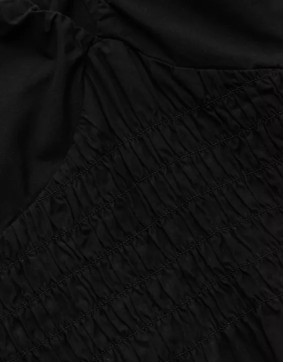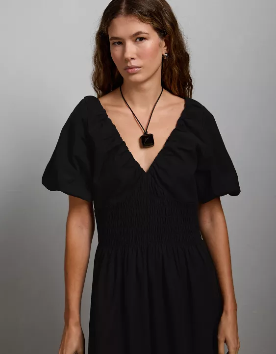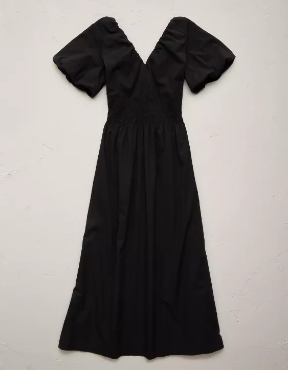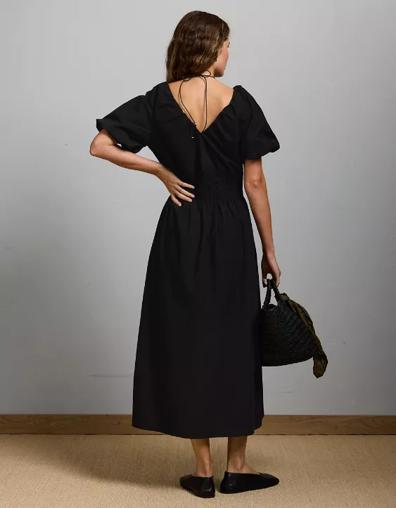 AE77 Premium Puff Sleeve Midi Poplin Dress Black
