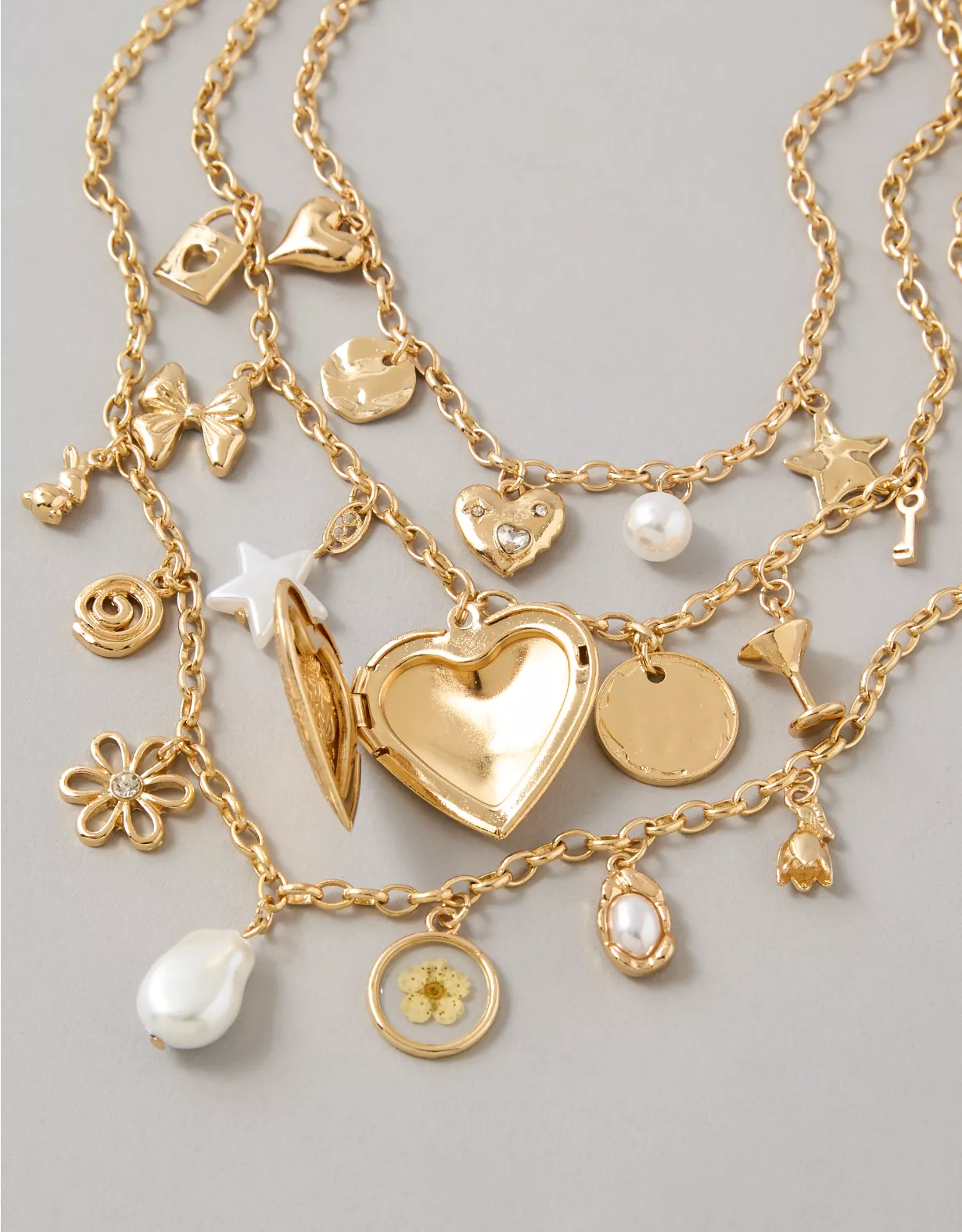 A delicate, layered gold charm necklace that adds a fun look to any ‘fit.