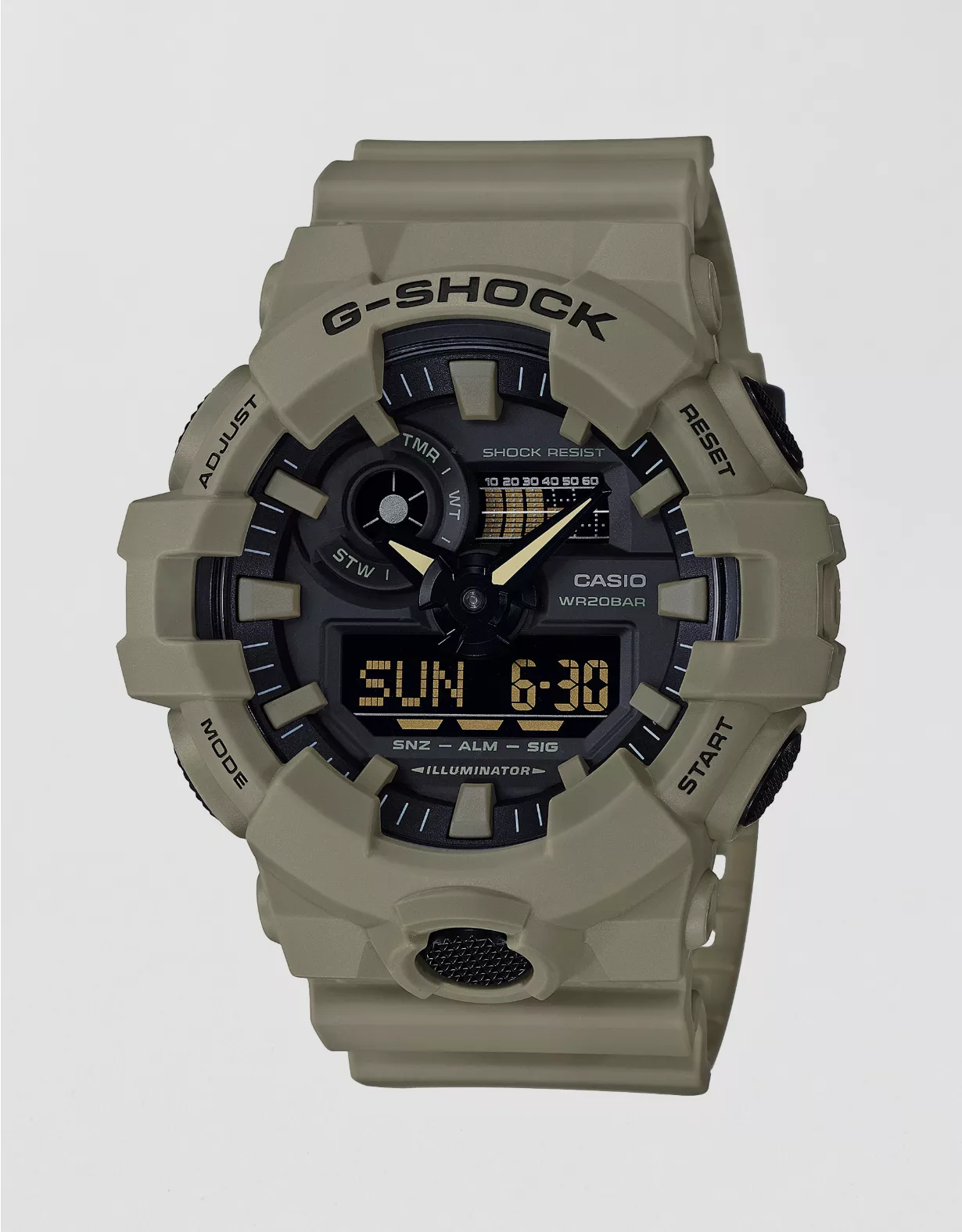 An analog-digital combination GA-700 model from G-SHOCK, which continues to pursue toughness and evolve. This watch improves readability using bold hands that are thick and powerful like carved metal, created using proprietary resin molding technology for the three-dimensional hour and minute hands. It also features a 3D face design achieved by making the dial ring and three-dimensional indices to create synergy with the bold hands.