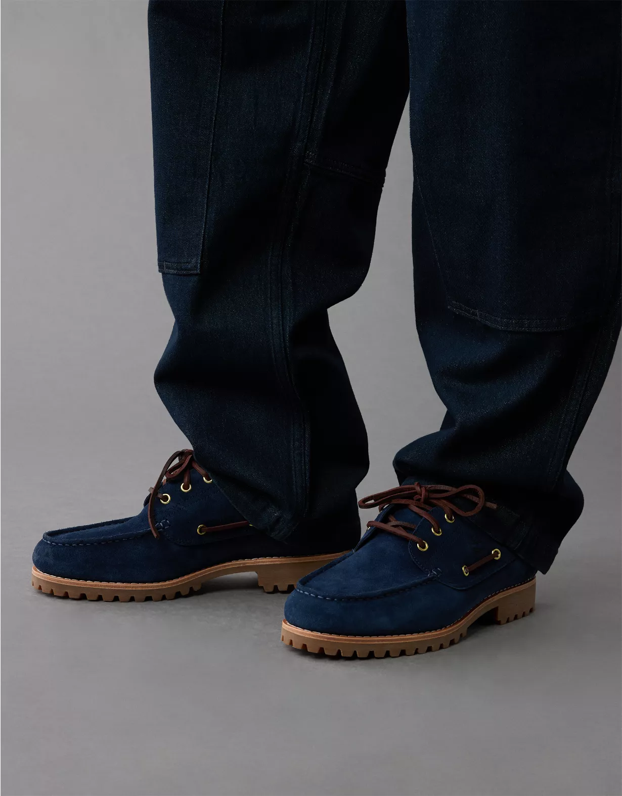 Timberland reimagined their trademark boat shoe with denim-inspired coloring, made from indigo suede and leather for an AE twist.